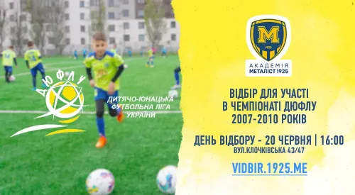 Дитяча академія "Металіст 1925" запрошує на перегляд юнаків 2007-2010 років народження для участі в чемпіонаті ДЮФЛУ сез...